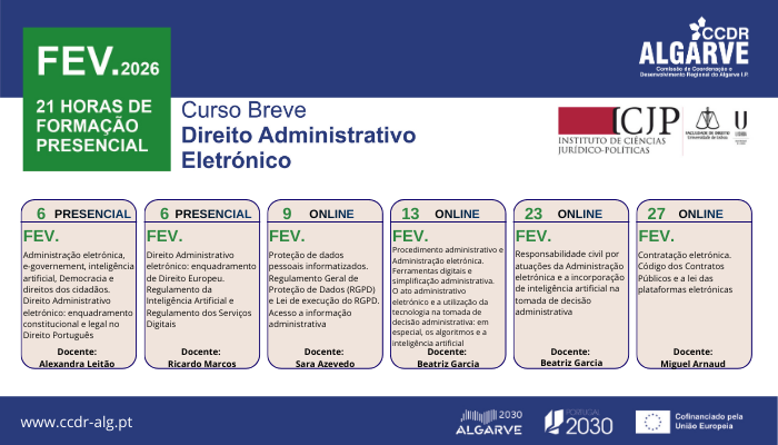 No âmbito da missão e atribuições da Comissão de Coordenação e Desenvolvimento Regional (CCDR) do Algarve, de promoção do desenvolvimento regional e apoio à decisão, está a decorrer uma ação de formação subordinada ao tema “Direito Administrativo Eletrónico”, promovida em parceria com o Instituto de (...)
