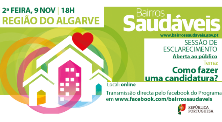 No contexto do Programa BAIRROS SAUDÁVEIS, na próxima segunda-feira, dia 9 de novembro, pelas 18 horas, realiza-se uma sessão de esclarecimento “COMO FAZER UMA CANDIDATURA?”, especialmente dedicada à Região do Algarve e na qual participa Helena Roseta, Coordenadora Nacional do Programa.