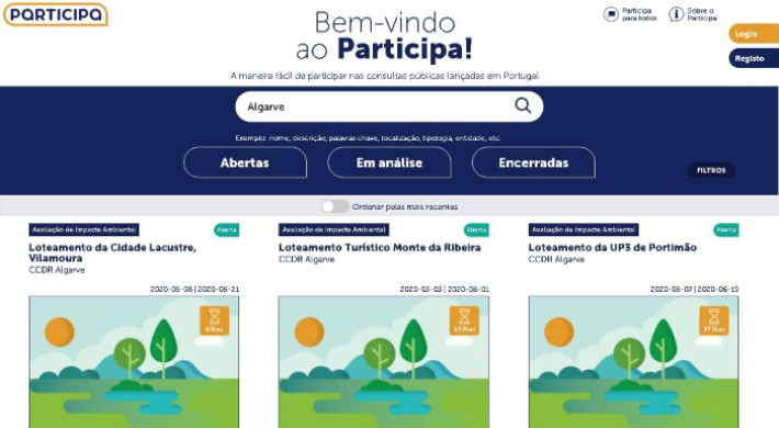 Neste contexto, neste momento, encontram-se em consulta pública no PORTAL PARTICIPA, os seguintes processos, sob a responsabilidade da CCDR Algarve: