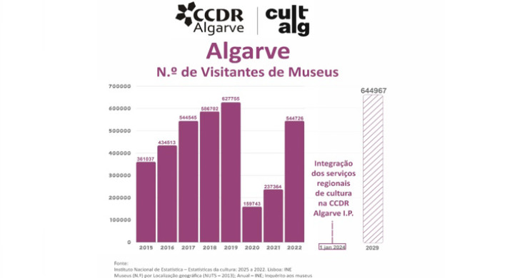 A observação dos dados do número de visitantes de Museus no Algarve conclui uma recuperação significativa do número de visitantes no ano de 2022, em comparação com o período de 2017-2019 (período anterior à pandemia COVID-19), uma evolução que acompanha os números nacionais, segundo dados do Instituto Nacional de Estatística (INE).