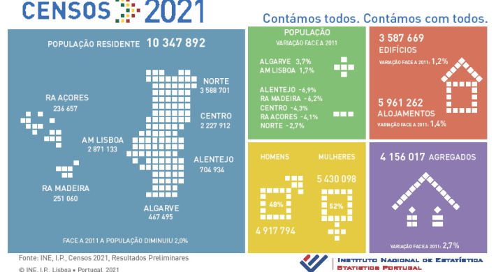 * A população residente em Portugal é de 10.347.892 pessoas, a maioria do sexo feminino.