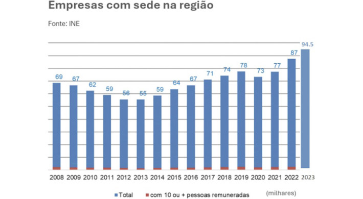 Este é o número mais elevado desde 2008, tendo o número de empresas sediadas na região crescido 8% entre 2022 e 2023, superando o crescimento em percentagem registado a nível nacional.