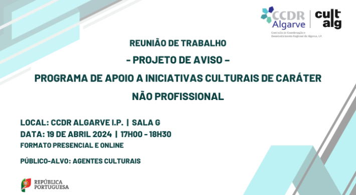 Na sequência do envio aos agentes culturais da Região do Projeto de Aviso, a Unidade de Cultura da Comissão de Coordenação e Desenvolvimento Regional (CCDR) do Algarve promove uma reunião de trabalho em formato híbrido (presencial e online) sobre o Programa de Apoio a iniciativas culturais regionais de carácter não profissional no dia 19 de abril (sexta-feira), pelas 17 horas, nas suas instalações na Praça da Liberdade, n.º 2, em Faro (Sala G).