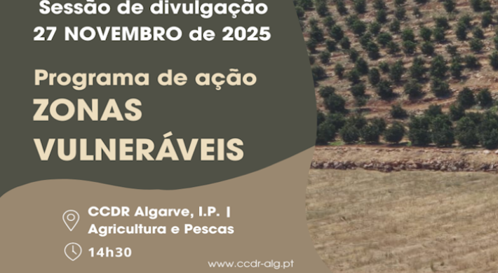 A Comissão de Coordenação e Desenvolvimento Regional do Algarve, IP (CCDR Algarve) irá realizar, no próximo dia 27 de novembro, às 14h30, uma Sessão de Divulgação do Programa de Ação para as Zonas Vulneráveis do Algarve, que terá lugar nas instalações da CCDR Algarve – Agricultura e Pescas, situadas no Patacão.