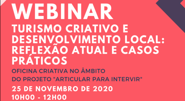 Realiza-se no dia 25 de novembro de 2020, pelas 10 horas, a Oficina Temática “Turismo Criativo e Desenvolvimento Local: Reflexão Atual e Casos Práticos”, organizada pela Comissão de Coordenação e Desenvolvimento Regional do Algarve (CCDR Algarve).