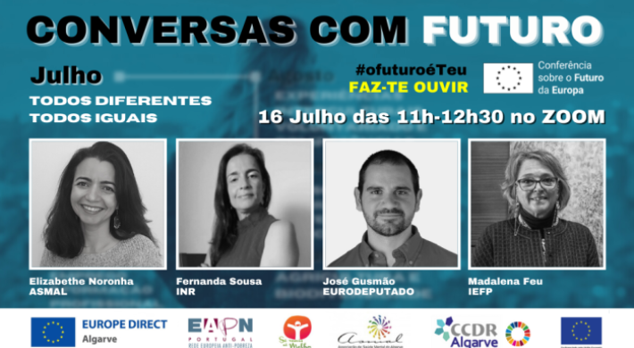 A Conferência sobre o futuro da Europa (CoFoE), que decorre até à primavera de 2022, enquadra o ciclo de Conversas com futuro |Future Talks –verdadeiros diálogos, abertos à região, que o Europe Direct Algarve promove visando dar a conhecer a conferência e sensibilizar para a sua importância, informar sobre a ação da União Europeia em cada um dos temas e abrir espaço à reflexão e à recolha de contributos a submeter na plataforma da CoFoE.