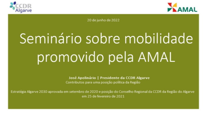 Considerando a Missão e atribuições das Comissões de Coordenação e Desenvolvimento Regional (CCDR) em contribuir para a definição da política de desenvolvimento regional no quadro da política de desenvolvimento económico e social do País, bem como fomentar parcerias entre agentes regionais, o Presidente da CCDR da região do Algarve, José Apolinário, apresentou no Seminário sobre Mobilidade promovido pela AMAL um contributo para uma visão regional sobre os desafios da mobilidade.