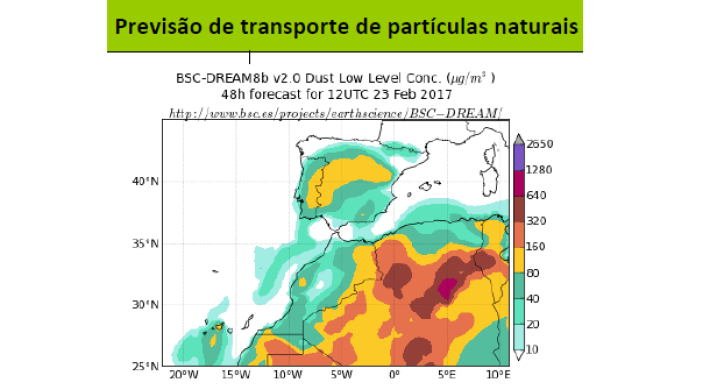 Como se pode comprovar no anexo, a previsão é que as partículas sejam superiores a 80 microgramas/m3 na região do Algarve. Para se ter uma noção da grandeza, refira-se que as partículas no Algarve rondam em média os 18 a 20 microgramas/m3.
