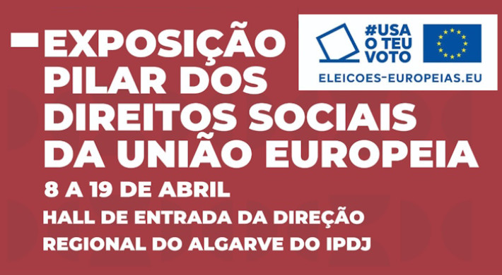A exposição sobre o Pilar Europeu dos Direitos Sociais: transformar os princípios em ações - Comissão Europeia (europa.eu) poderá ser visitada em vários locais até ao final de maio. Até 19 de abril no IPDJ, de 20 a 30 de abril no Centro Distrital de Faro do Instituto de Segurança Social e, durante o mês de maio, na sala de exposições da Comissão de Coordenação e Desenvolvimento Regional (CCDR) do Algarve, I.P., assinalando o mês da Europa.
