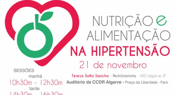 No contexto da promoção pela Comissão de Coordenação e Desenvolvimento Regional do Algarve (CCDR Algarve) de hábitos alimentares saudáveis, realiza-se no dia 21 de novembro, uma sessão sobre Nutrição e Alimentação na Hipertensão, no seu auditório, em Faro, dirigida à população em geral.