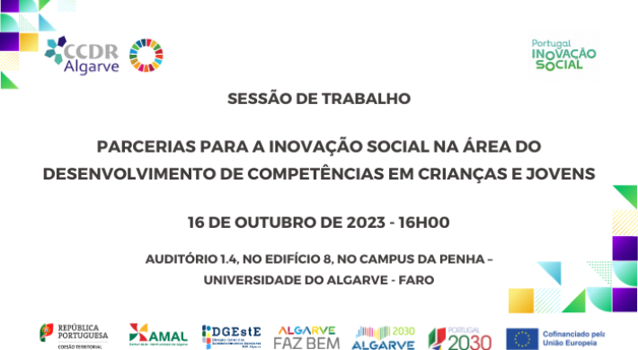 Data 16 Out 2023 | 16h - 18h30 Local Universidade do Algarve - Campus da Penha Morada Auditório 1.4, no Edifício 8, no Campus da Penha – Faro Sessão de Trabalho Parcerias para a Inovação Social na área do desenvolvimento de competências em crianças e jovens × Mensagem de estado As inscrições encontram-se encerradas.