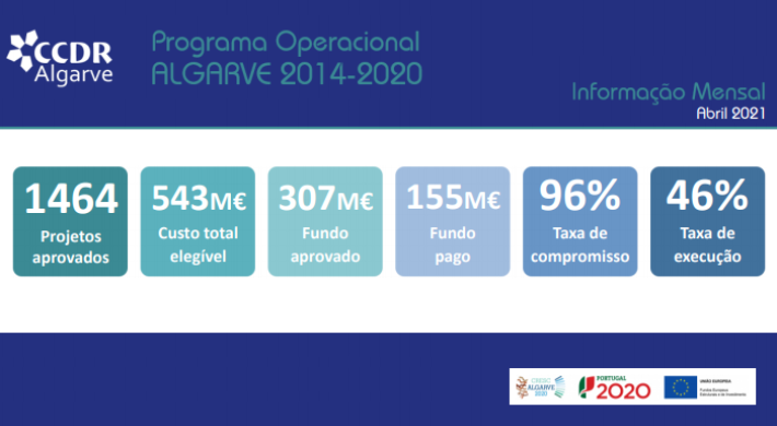 Até 30 de abril, a taxa de execução do Programa Operacional do Algarve atingiu os 46 por cento, tendo cumulativamente sido aprovados 1464 projetos no PO Algarve, com um investimento elegível de 543 Milhões de Euros, a que corresponde um financiamento comunitário de 307 M€.