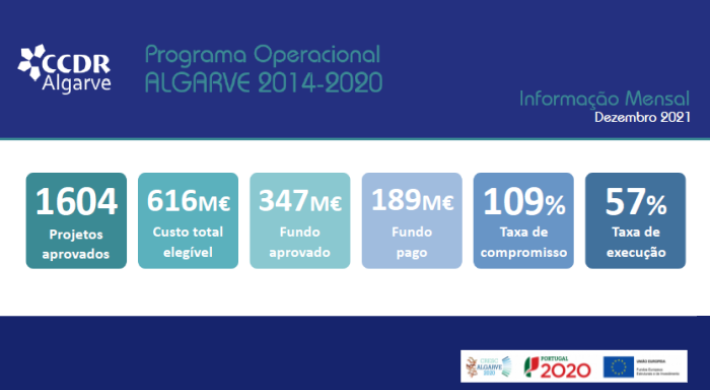 Até 31 de dezembro, foram aprovados 1604 projetos no Programa Operacional do Algarve, com um investimento elegível de 616 Milhões de Euros (M€), a que corresponde um financiamento comunitário de 347 M€ e uma execução de 282 M€. Os pagamentos efetuados ascendem a 189 M€.