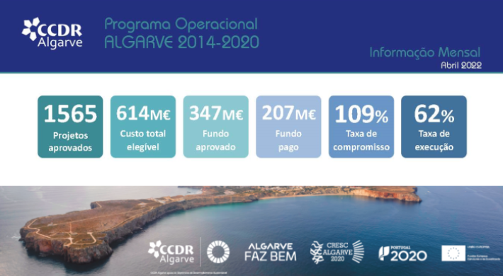 Até 30 de abril, foram aprovados 1565 projetos no Programa Operacional do Algarve, com um investimento elegível de 614 Milhões de Euros (M€), a que corresponde um financiamento comunitário de 347 M€ e uma execução de 310 M€. Os pagamentos efetuados ascendem a 207 M€.
