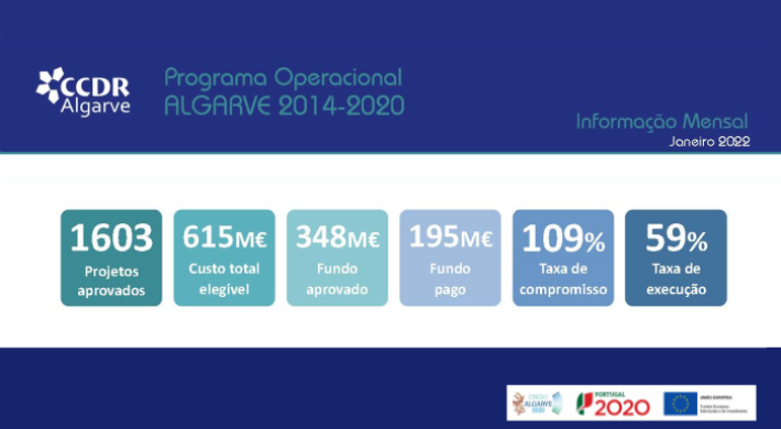 Até 31 de janeiro, foram aprovados 1603 projetos no Programa Operacional do Algarve, com um investimento elegível de 615 Milhões de Euros (M€), a que corresponde um financiamento comunitário de 348 M€ e uma execução de 295 M€. Os pagamentos efetuados ascendem a 195 M€.