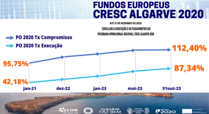 O Programa Operacional Regional CRESC Algarve 2020 atingiu no final de outubro 87,34 % de taxa de execução, com 278 Milhões de Euros (M€) executados e um investimento de cerca de 428 M€.