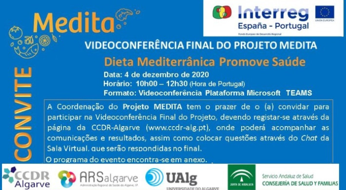A CCDR Algarve coordenou o projeto 0290_MEDITA_5_P – Dieta Mediterrânica promove saúde que agora finaliza e teve como parceiros a ARS Algarve, IP, a Universidade do Algarve e Servicio Andaluz de Salud-Junta da Andaluzia. O projeto Dieta Mediterrânica promove saúde é cofinanciado pelo Programa INTERREG V – POCTEP foi aprovado na primeira convocatória com o orçamento de 329.300,31€, a que corresponde uma comparticipação do FEDER de 246.975,24 €, para executar entre 01/01/2016 e 31/12/2019, tendo posteriormente sido prorrogado até 31-12-2020.
