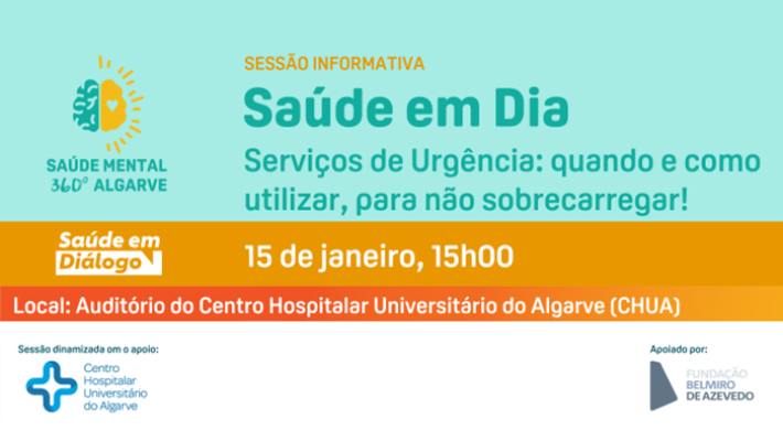Numa iniciativa do Projeto Saúde Mental 360º Algarve, com o mote “Saúde em Dia: Serviços de Urgência: Quando e como utilizar, para não sobrecarregar!” realiza-se uma sessão informativa no dia 15 de janeiro de 2024, pelas 15 horas, no Auditório do Centro Hospitalar Universitário do Algarve.